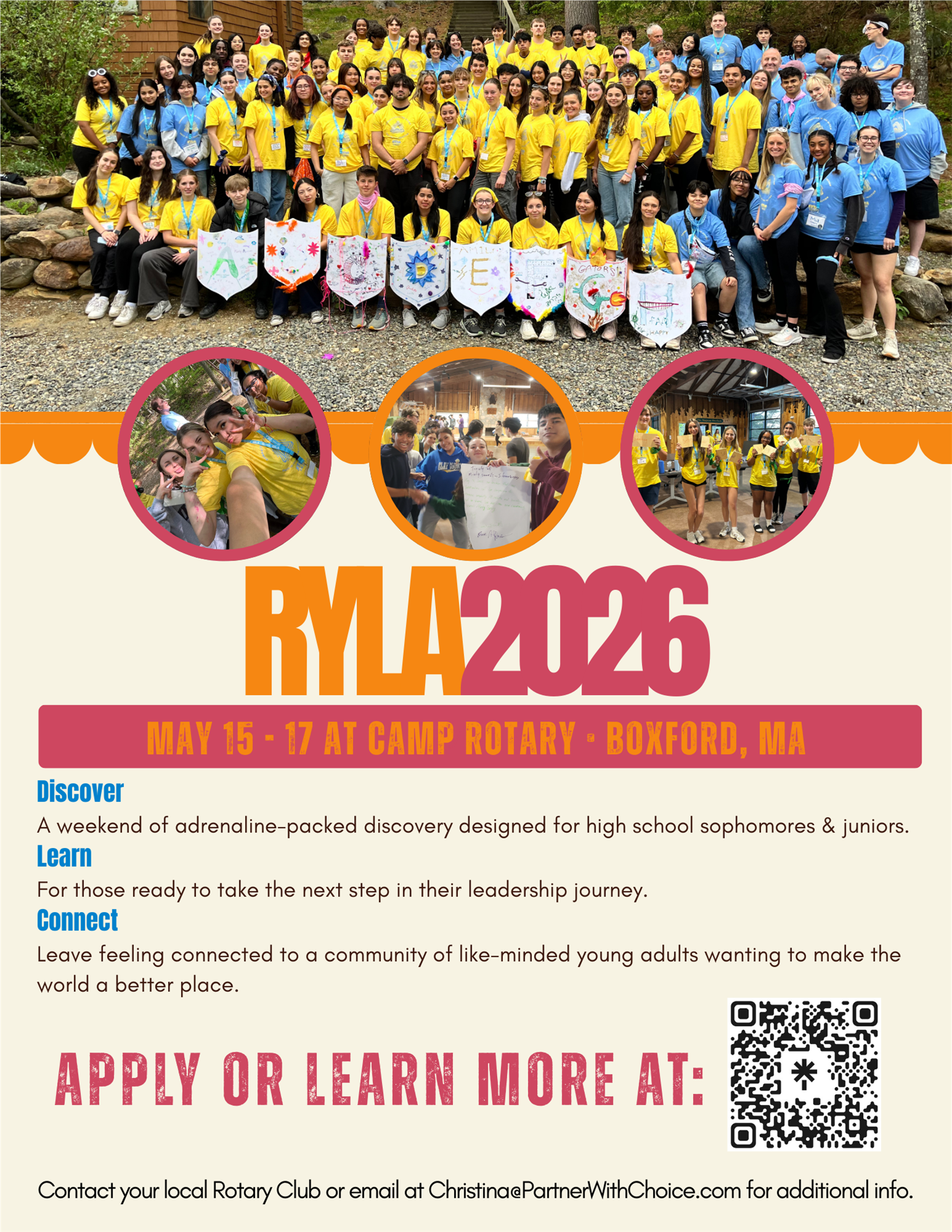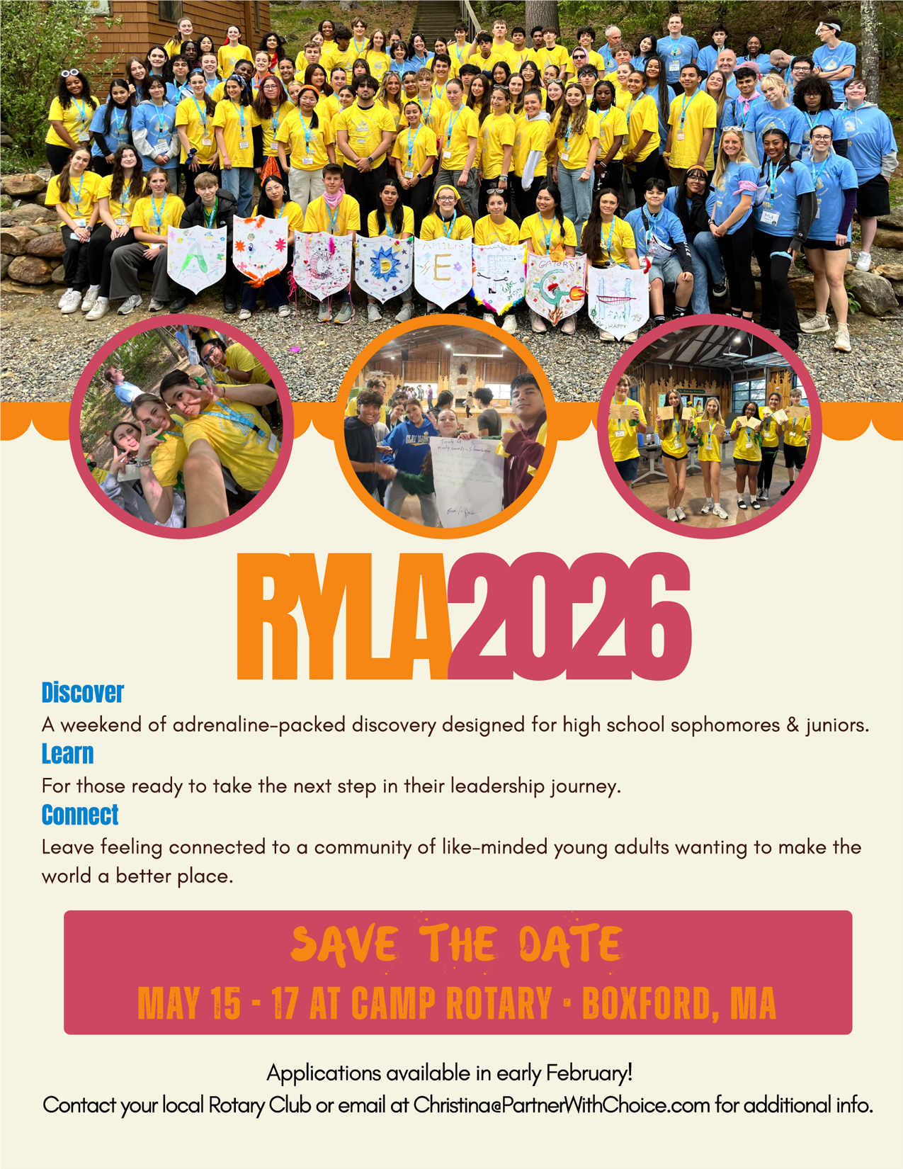 RYLA, May 15-17, 2026, at Camp Rotary, Boxford, MA.