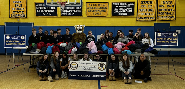 In November, Arlington Catholic High School Interact completed their annual Blessing Bags Event. Arlington Rotary, Arlington K of C Council 109, and the Arlington Police Department assisted Interact in supporting the Salvation Army and local individuals and families in need. Interact was able to assemble 36 kids' bags for children at the Salvation Army's daycare center. In addition, they filled over 200 bags with toiletries, warm gloves, hats, and socks, providing comfort to many in need during the cold winter months.Rotarian Advisor Christy Kiernan and fellow teacher Rev. Dominic Ngo called for a special shoutout to high schooler Tess McQuillan for creating a helpful pamphlet of local resources to share with recipients, and to Theology teacher Ms. Przytula's classes for raising extra donations. The entire Interact Club worked together to get the packets out before the cold weather.