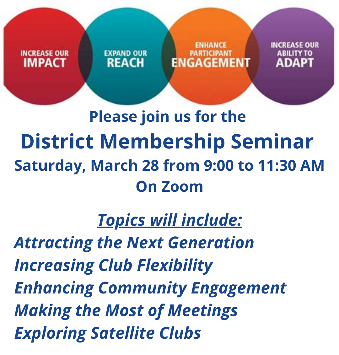Most Rotary clubs report that adding and retaining members is an area of concern. So, please join us for a District Membership Seminar on Saturday, March 28 from 9 to 11:30 AM on Zoom.The session will feature thirty-minute break out rooms on 4 topics. This seminar promises to be lively, interactive and full of helpful ideas to bolster your club membership plans. Registration is at this link. There is no fee for this event.