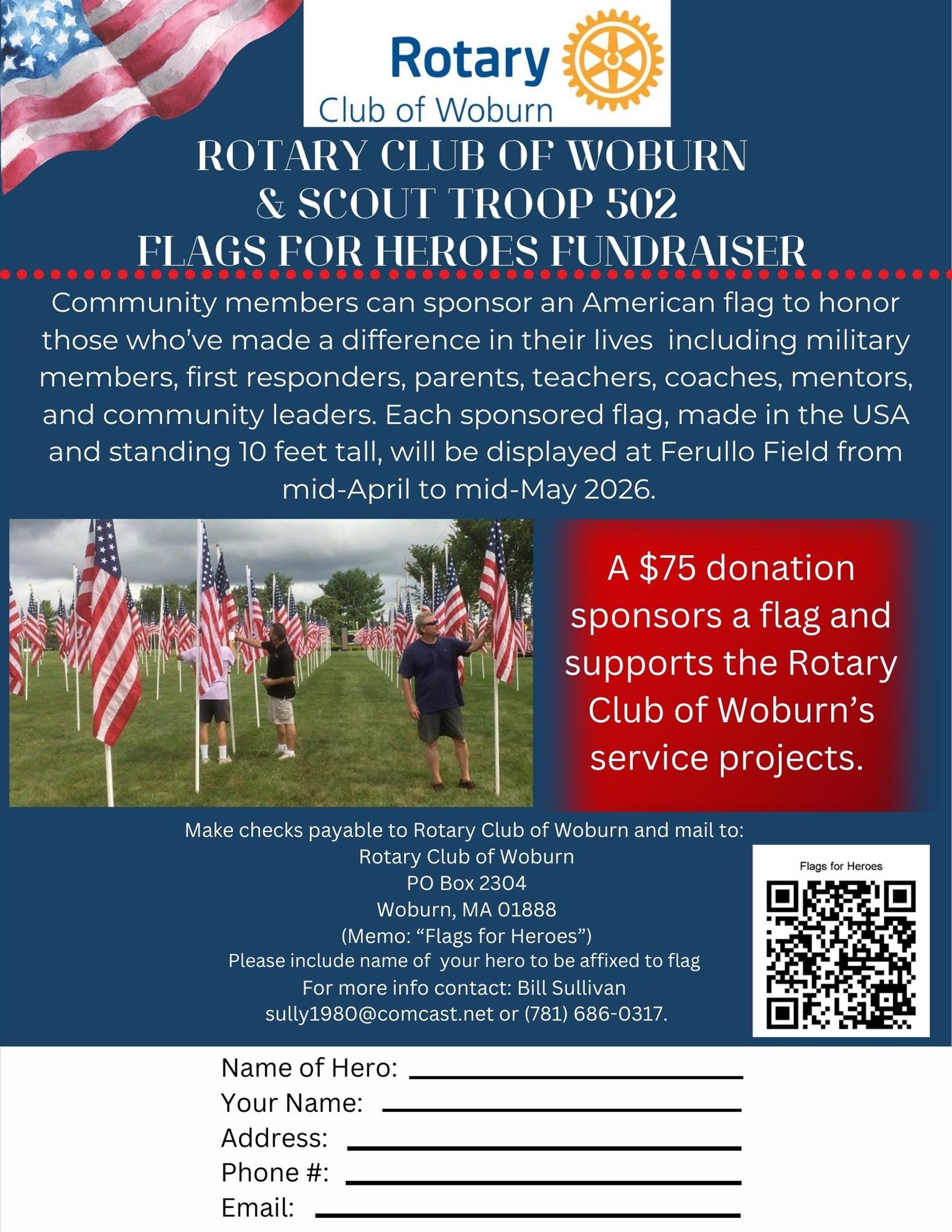 Rotary Club of Woburn has launched it's second year of honoring community members with Flags for Heroes. The fundraiser will not only benefit Woburn Rotary but Woburn Scout Troop 502 as well. The scouts play a major role in installing the flags and and flag maintenance.The flags will fly at Woburn's Ferullo Field from mid April to mid May.